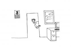 The next day, Bill arrives at his office and his hair is all over the place. -